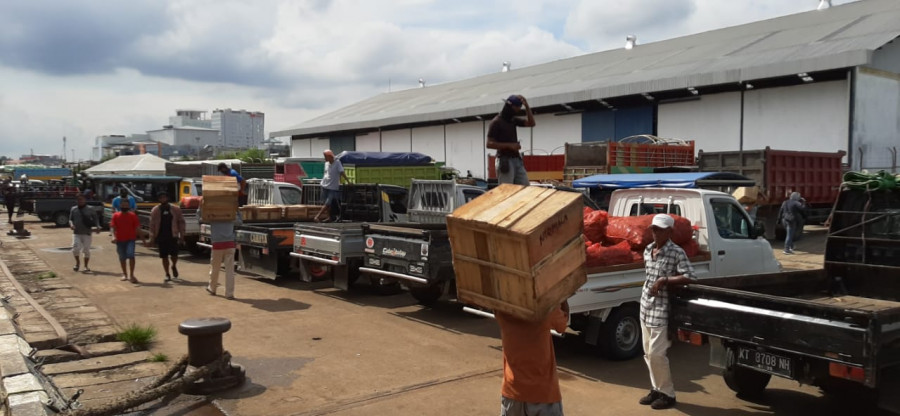 Para buruh yang sedang melakukan pengangkutan logistik bahan pokok, usai KM Queen Soya bersandar Minggu (26/4/2020) hari ini. (Foto:Nancy/korankaltim.com)