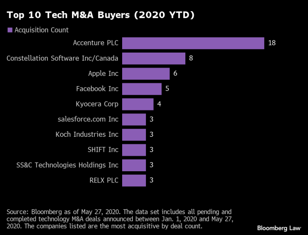 So far in 2020, Apple Inc. is the most active in mergers and acquisitions among the top five firms on the Fenwick – Bloomberg Law SV 150 List, with six completed M&A acquisitions. This number of acquisitions also puts Apple Inc. at the No. 3 spot among the worldwide top tech M&A buyers, led by Accenture PLC and Constellation Software of Canada.