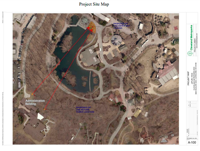 Like ski lifts, the Soaring Eagle Zipline will originate and return to the same location. (The site map is visible above). These dual ziplines will be installed "such that the loading/unloading platform borders Waterfowl Lake in the Zoo between Stillwater Place and Wade Hall," according to the project description. The there-and-back ride will "provide users unobstructed views of the Downtown Cleveland skyline and the Zoo below."