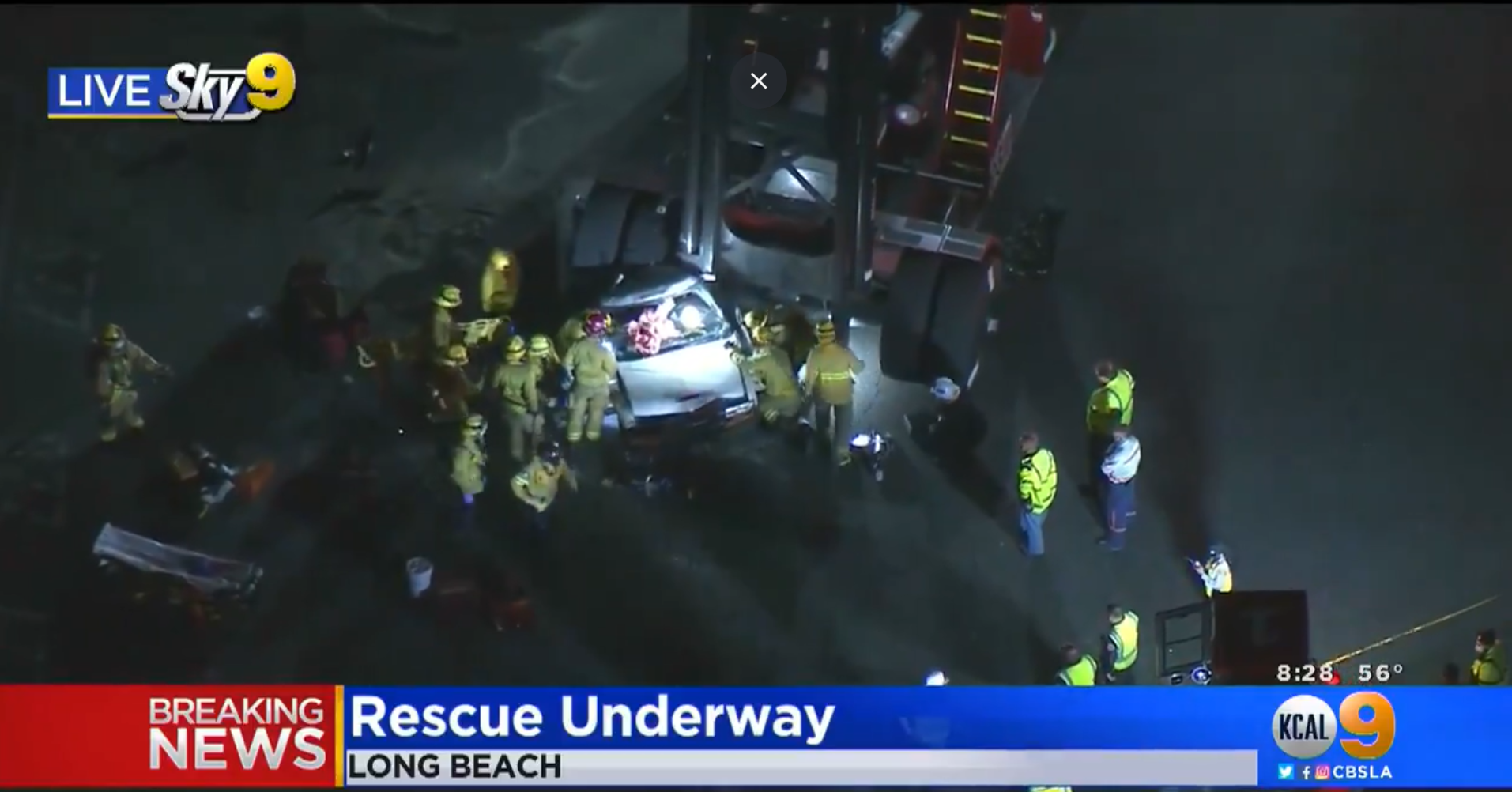 #BREAKING: A horrific crash at the @portoflongbeach has sent one person to the hospital after a very large piece of equipment ran over a small pickup truck. @RoadSageLA overhead in #Sky9 as @LBFD rescued the person in the pickup. #CBSLA pic.twitter.com/sldXCKiSlY
