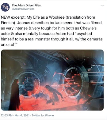 According to an excerpt posted on Twitter, Suotamo (who has played Chewie since The Force Awakens) has written about a scene filmed between himself and Adam Driver for The Rise of Skywalker which would have fully shown Chewbacca’s torture at Kylo Ren’s hands.