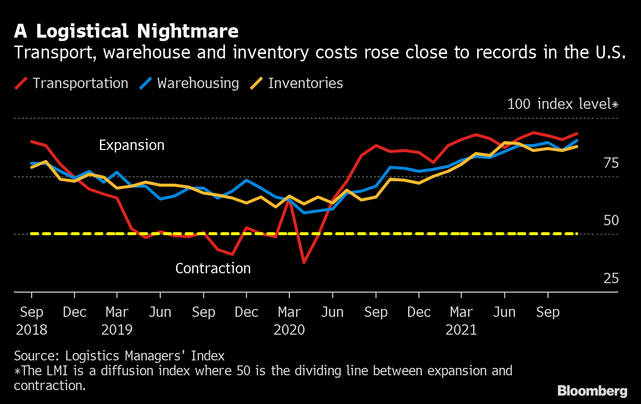 The monthly U.S. Logistics Managers’ Index released last week showed continued strains in supply chains. The gauge climbed for a second month in November, reflecting warehouse costs that jumped to a record, as well as rising inventory and transportation expenses and survey respondents don’t anticipate any significant relief over the next 12 months.